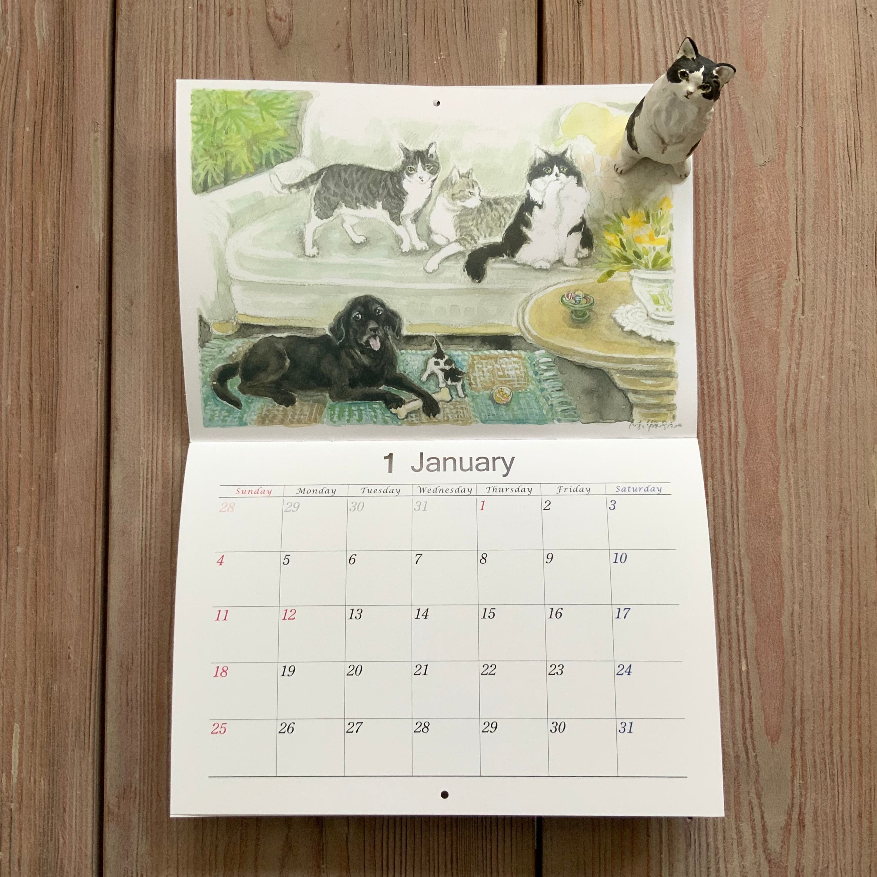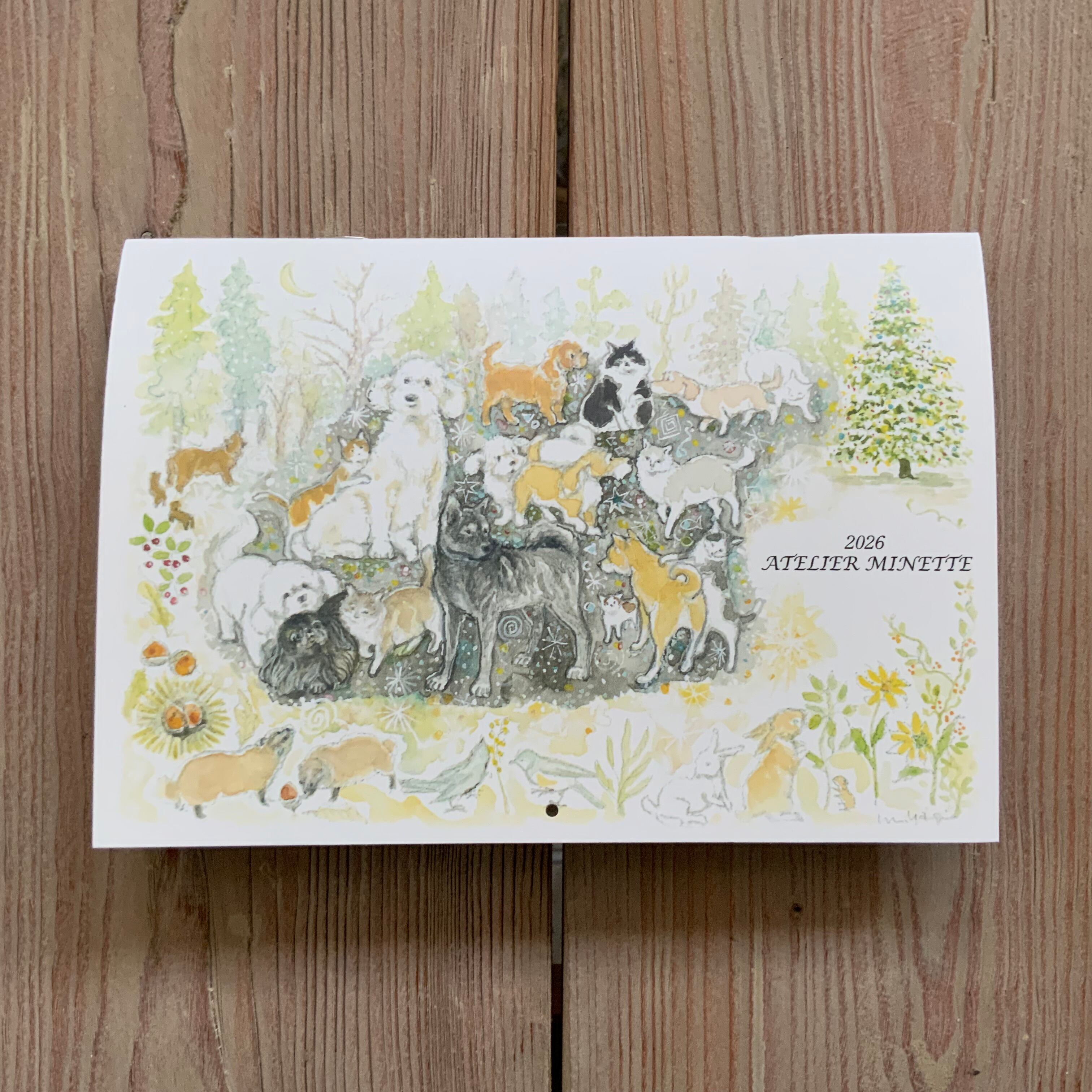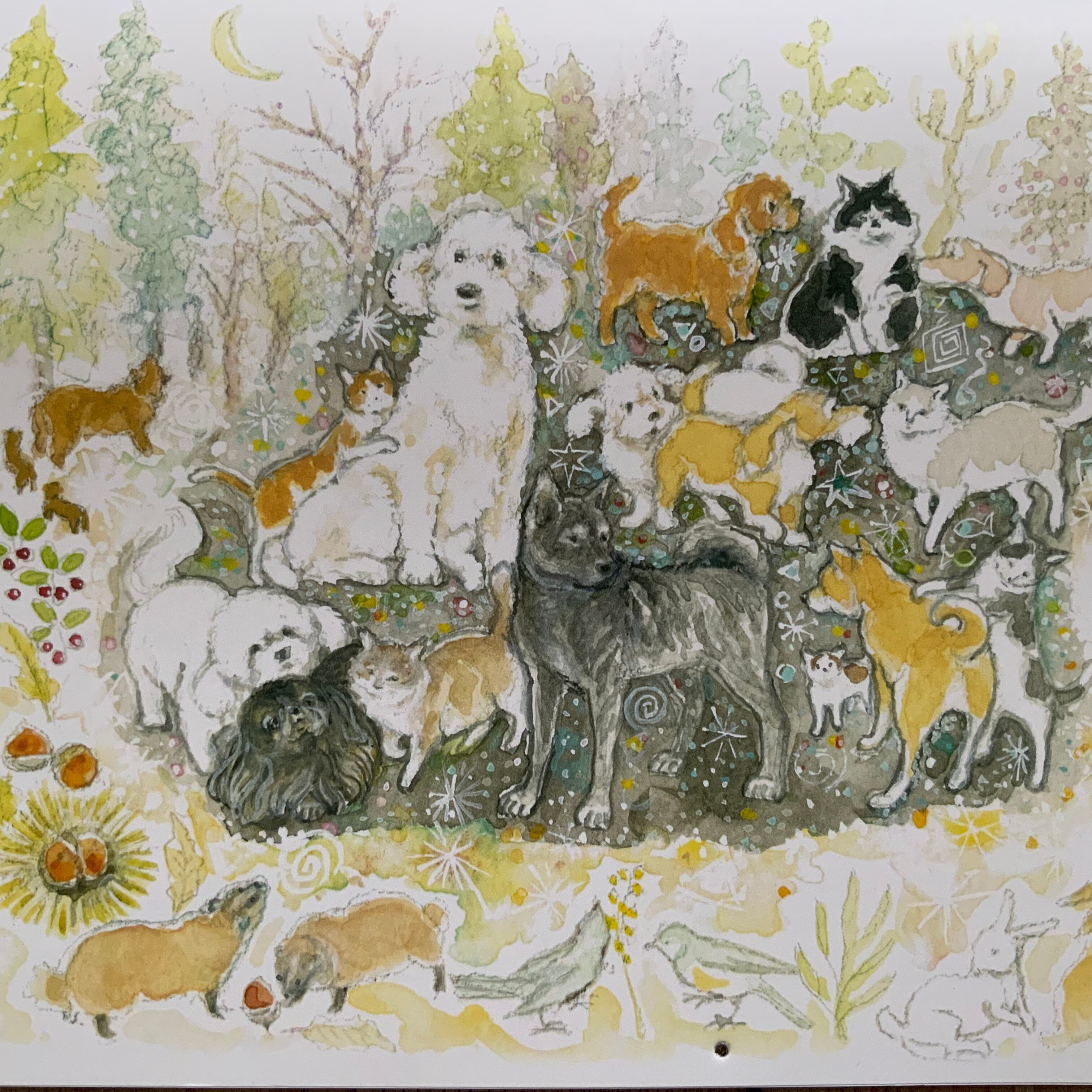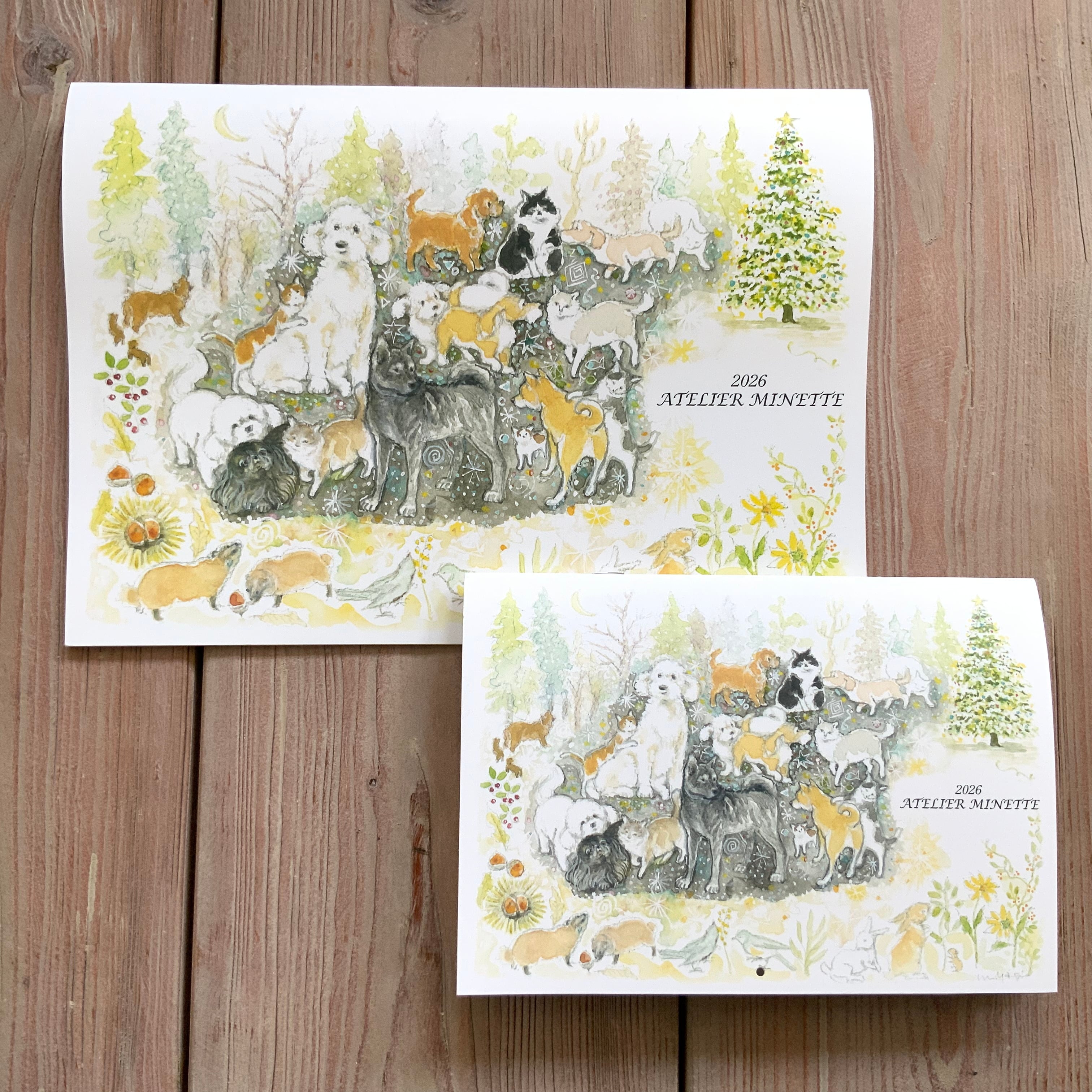 1年間で描き溜めた13枚の生き生きした猫と犬そして森の動物たちの作品が、毎年この時季にカレンダーになります。
