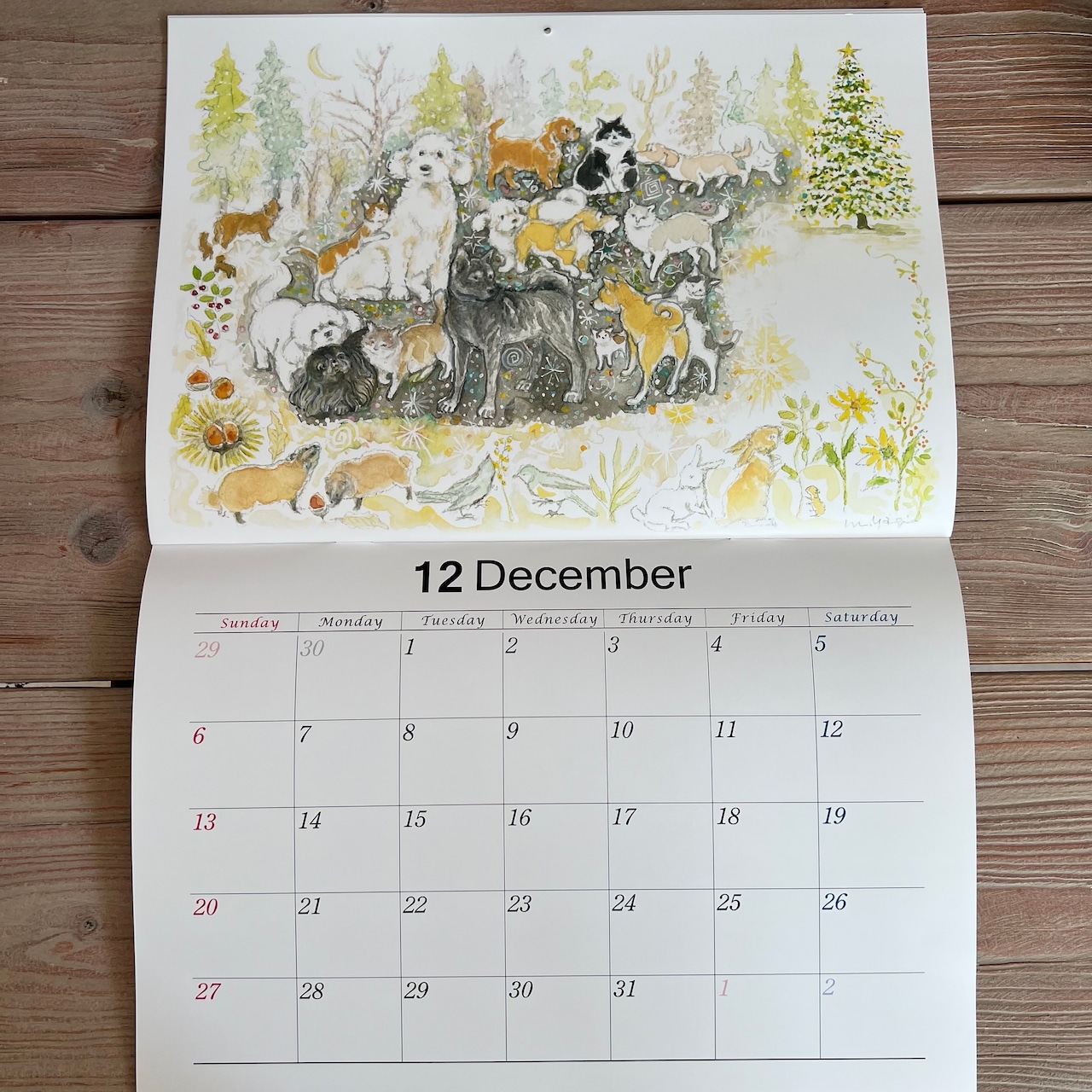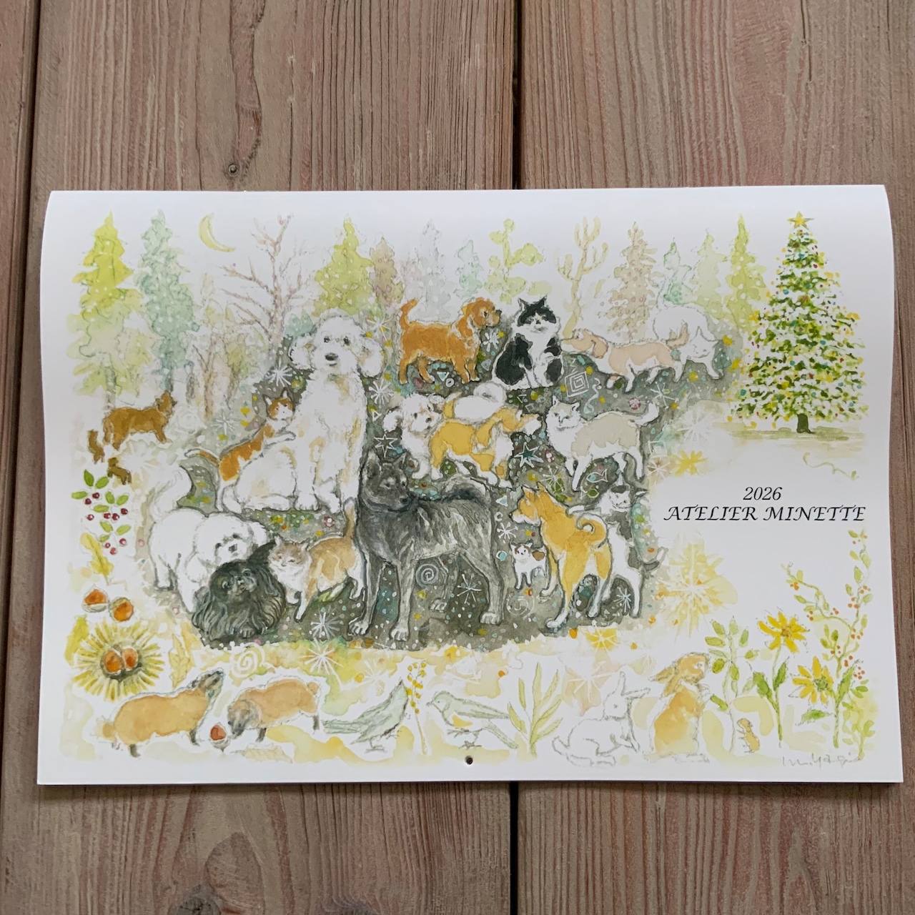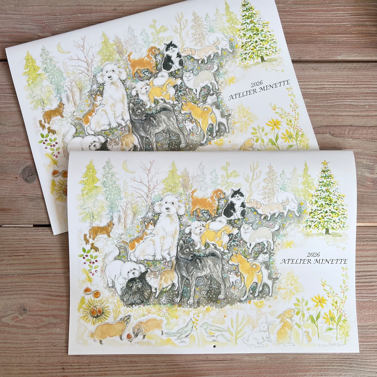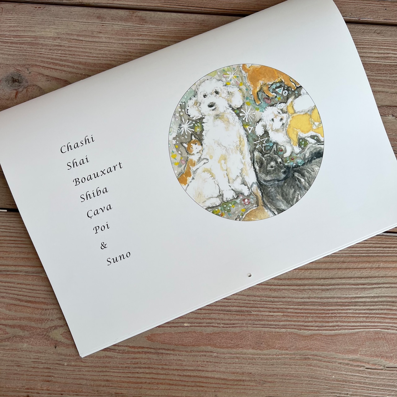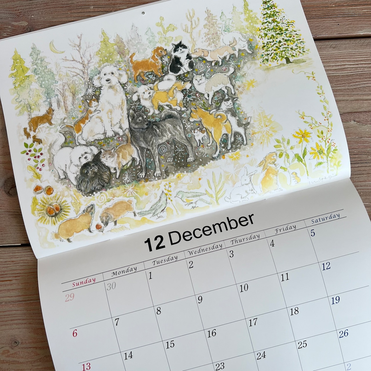 1年間で描き溜めた13枚の生き生きした猫と犬そして森の動物たちの作品が、毎年この時季にカレンダーになります。