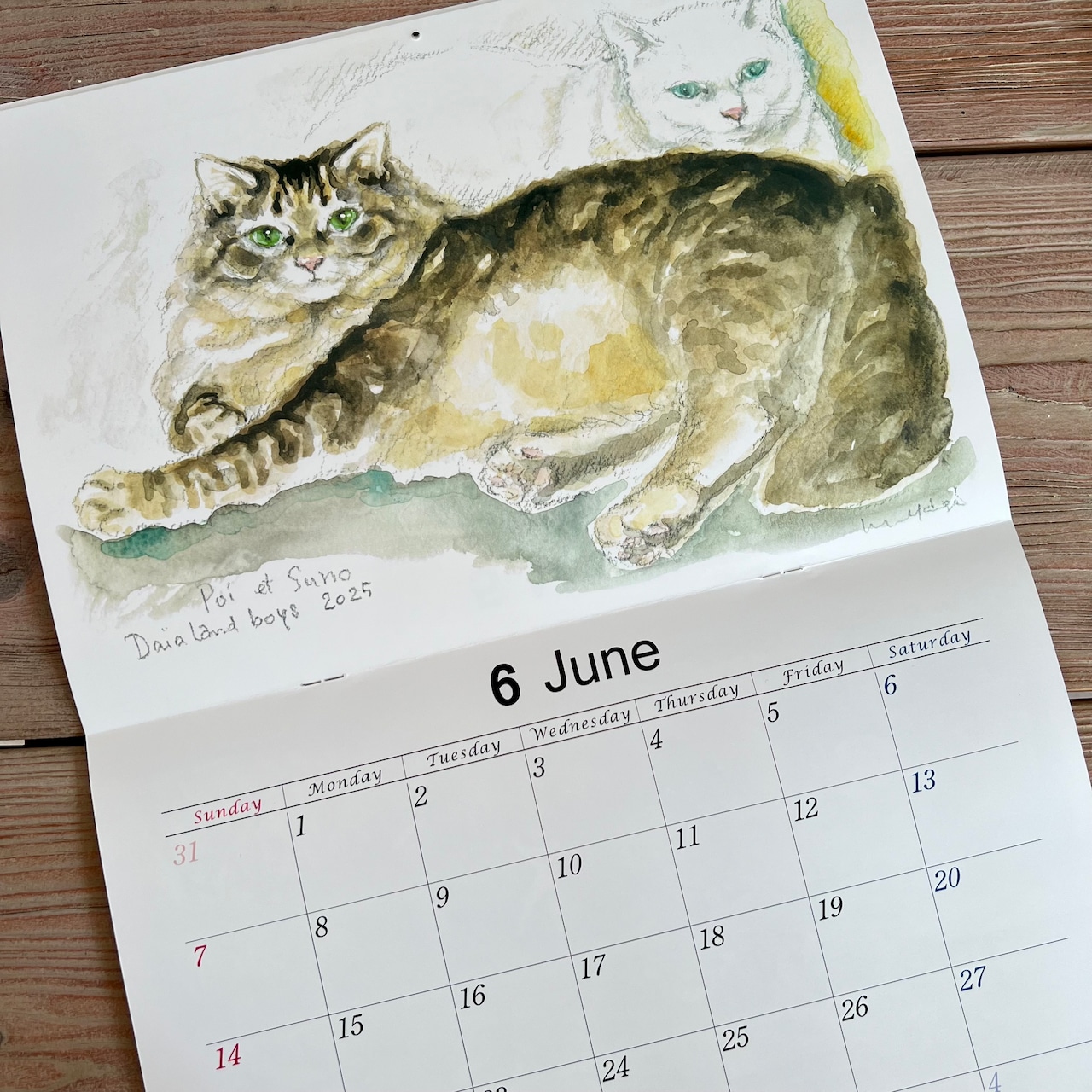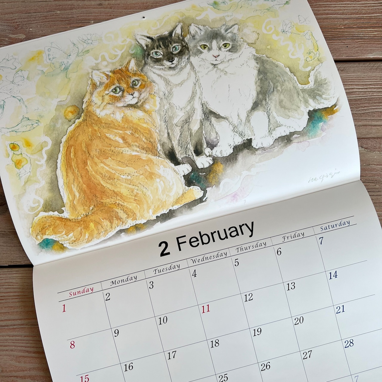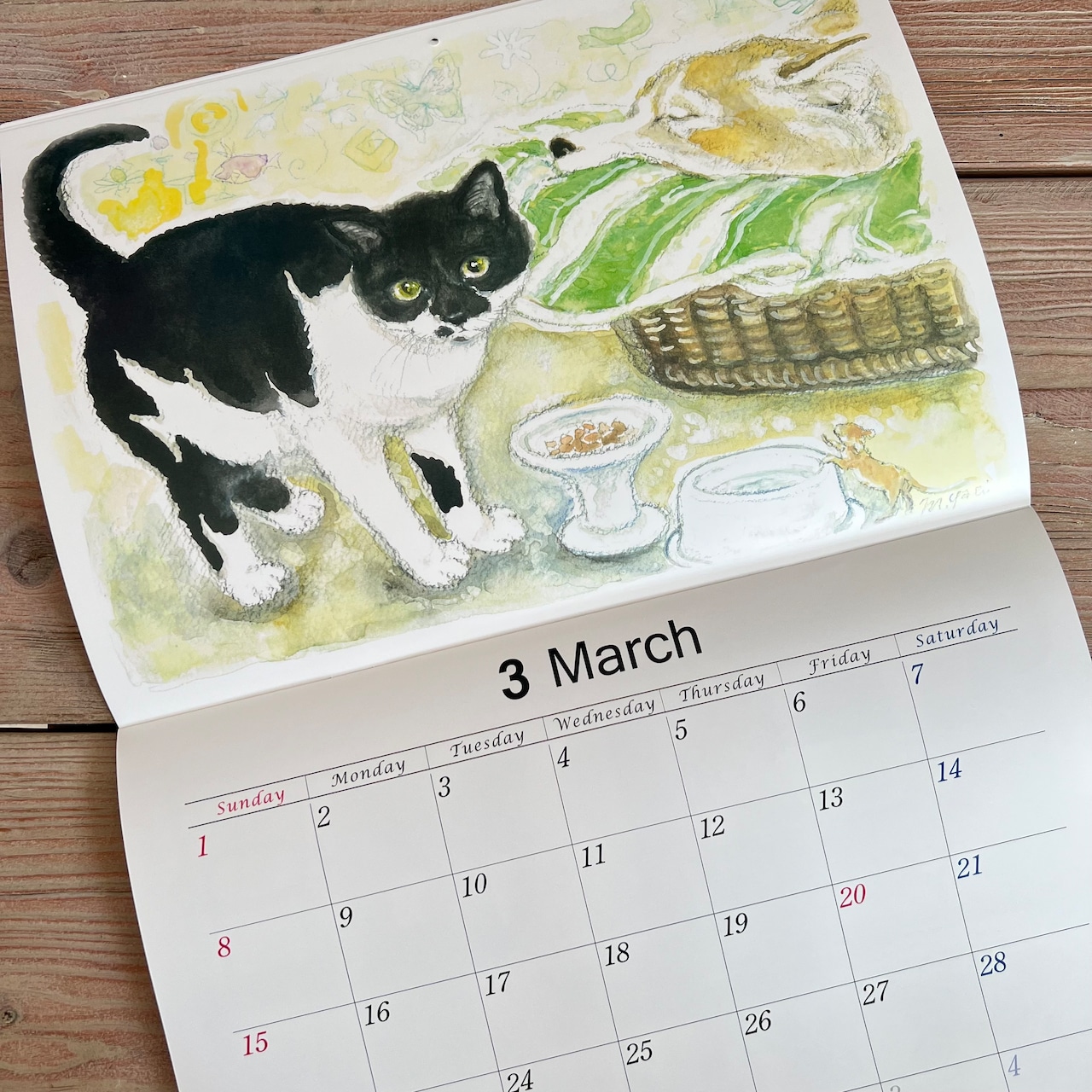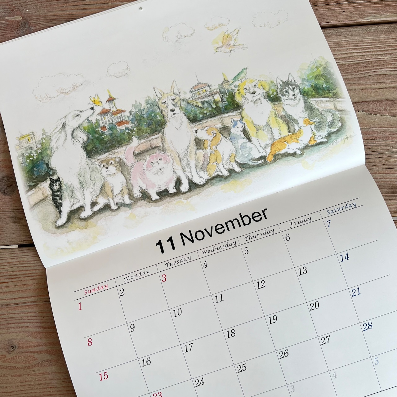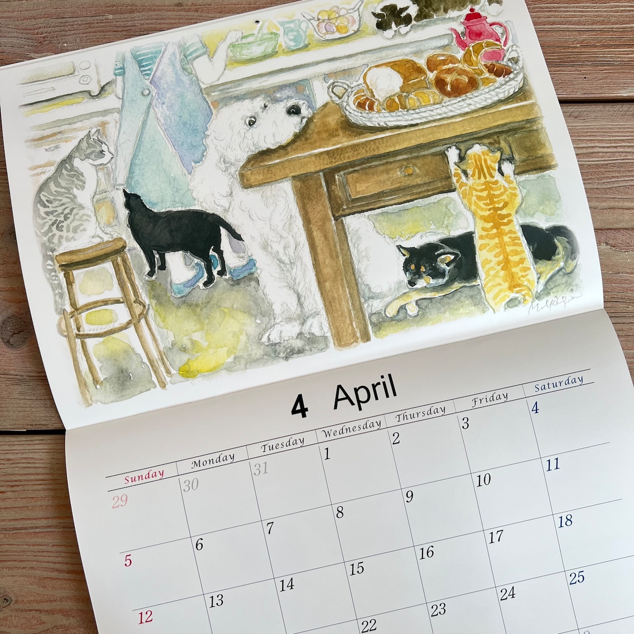 1年間で描き溜めた13枚の生き生きした猫と犬そして森の動物たちの作品が、毎年この時季にカレンダーになります。