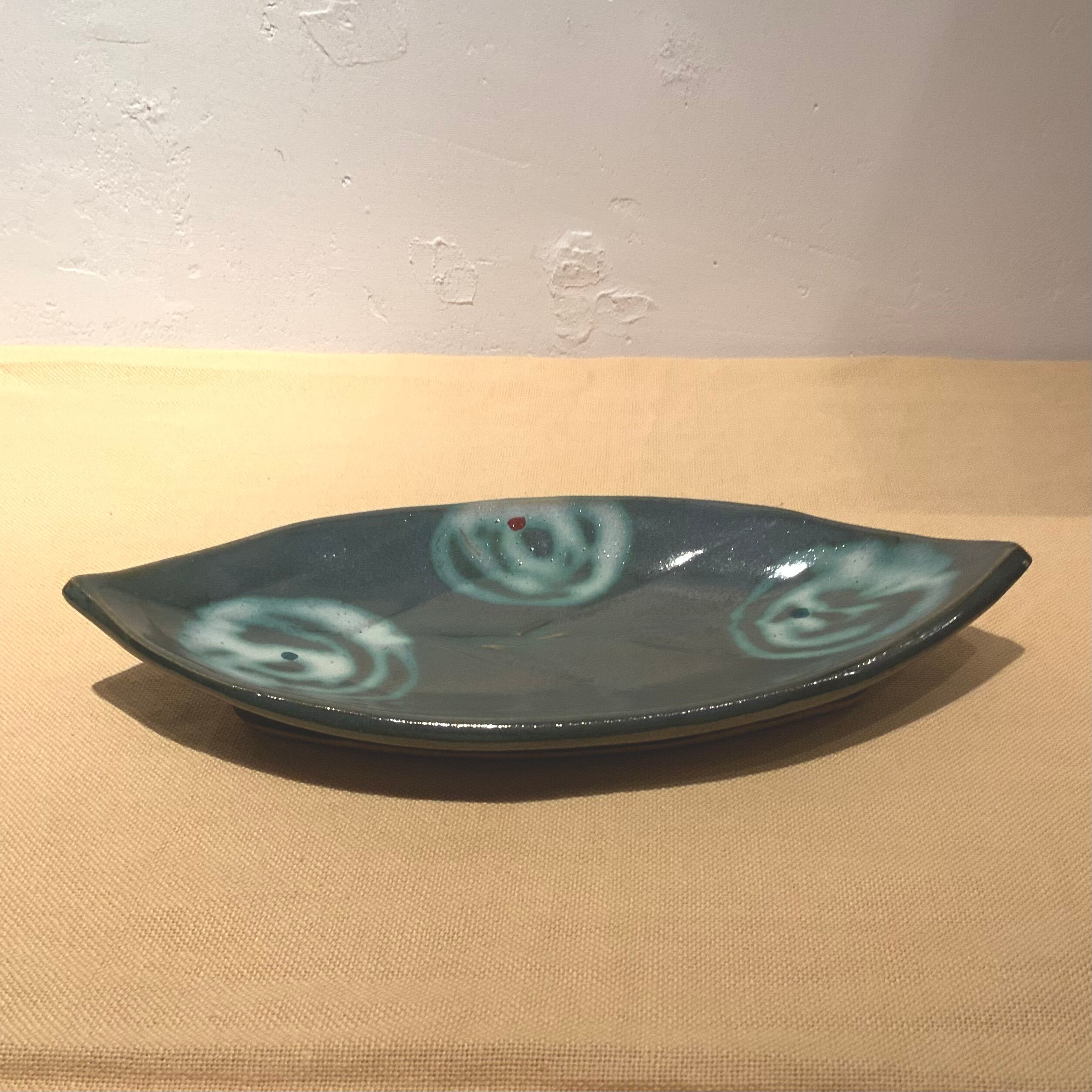 この皿は益子の土と濱田窯制作の釉薬、そして登り窯で焼成して出来上がりました。濱田窯、登窯では岩手産の松の薪を使って焼成され、松脂(マツヤニ)は表面のガラス質となり輝きを放ちます。